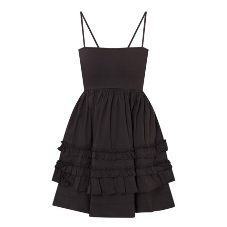 Straight neckline fixed narrow straps smocked back tiered skirt two side in seam pockets ruffle detailing mini length