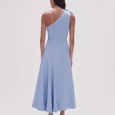 Midi dress Asymmetrical neckline One shoulder strap Fitted bodice Frill organza gathering detail Raw cut frills Full skirt Side pockets Zip, hook and eye closure Lined