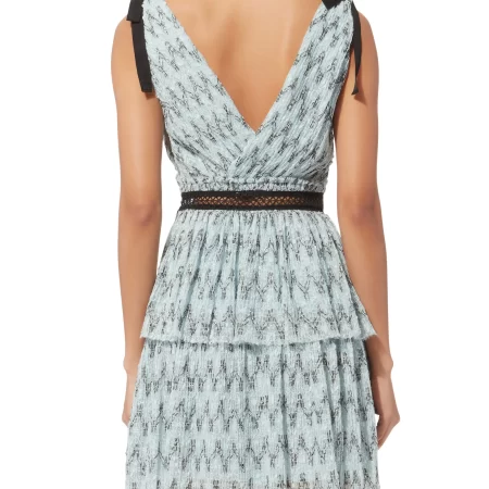 Rent From €60.00Available in Size: UK 14 - In a pleated metallic mesh, this tiered mini dress features a plunging wrap neckline and a trimmed waistband. - Contrast ribbon ties at shoulders. - Deep V-back. - Concealed zip closure. - Double tier skirt. - Lined. - In light blue. - Fabric: 100% […]