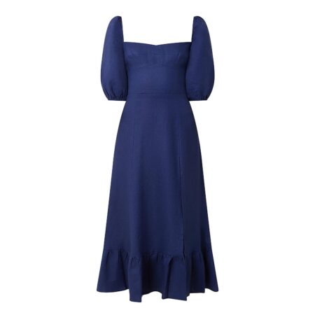 Rent From €80.00Fits true to size – Take your normal size Model is 175cm/5ft 9in and is wearing size S Puff sleeves. back zipper midi length side slit ruffled hemline Composition and Care: 100% linen.