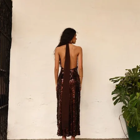Rent From €100.00LIMITED EDITION - Ankle-length dress made of fancy knit fabric forming vertical stripes in brown. Adjustable dark brown chiffon straps. Adjustable V-shaped neckline. Low back. Side invisible zipper. Brown satin interior lining. MADE IN SPAIN The model is wearing size XS Note: Prices shown are daily rental rates – Minimum […]