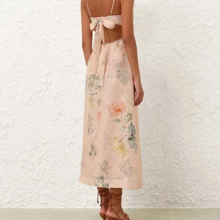 Rent From €160.00The Illuminate Drawn Slip Dress in Peach Hydrangea from our Spring 2025 Collection, Illumination. A silk linen midi dress featuring a rouged bust with a self tie detail at the front with 3D flower trims on the ends, adjustable shoulder straps, and a self tie bow detail at the center […]