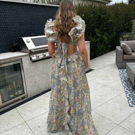 - Blue Meadow - Fully lined - Floral placement print - Cut from waist to back - Ruffles waist shoulders and back - Fitted at bust - Deep v-neckline - Self tie closure at upper back - Invisible zip on back skirt - Undergarment: Lace up bra